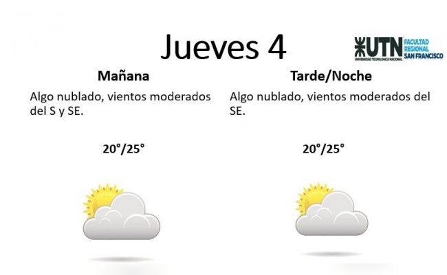 El jueves, por su parte, estará "algo nublado, con vientos moderados del S y SE". La temperatura mínima es de 20° y la máxima de 25°.