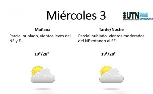 El miércoles se presentará "parcial nublado, con vientos leves del NE y E, por la tarde/noche los vientos estarán rotando al SE". La mínima pronosticada es de 19° y la máxima de 28°.