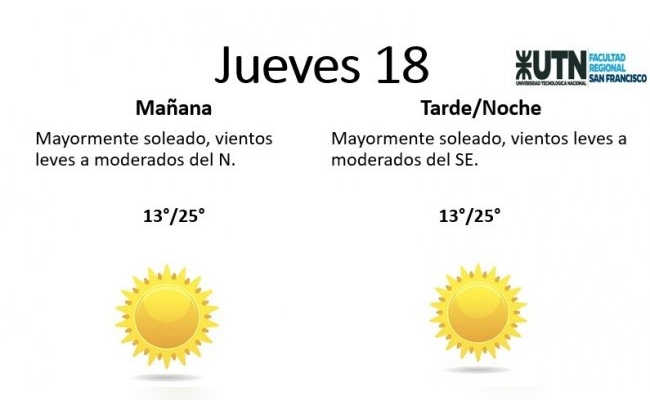 El jueves, por su parte, estará "mayormente soleado, con vientos leves a moderados del N y por la tarde/noche el viento rotará hacia el SE". La temperatura mínima es de 13° y la máxima de 25°.