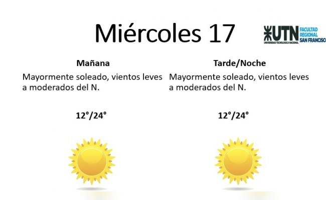 El miércoles se presentará "mayormente soleado, con vientos leves a moderados del N". La mínima pronosticada es de 12° y la máxima de 24°.