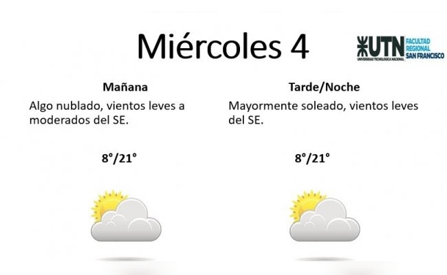 El miércoles se presentará "algo nublado, con vientos leves a moderados del SE y por la tarde estará mayormente soleado". La mínima pronosticada es de 8° y la máxima de 21°.