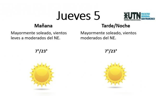 El jueves, por su parte, estará "mayormente soleado, con vientos leves a moderados del NE". La temperatura mínima es de 7° y la máxima de 23°.