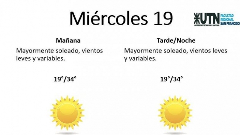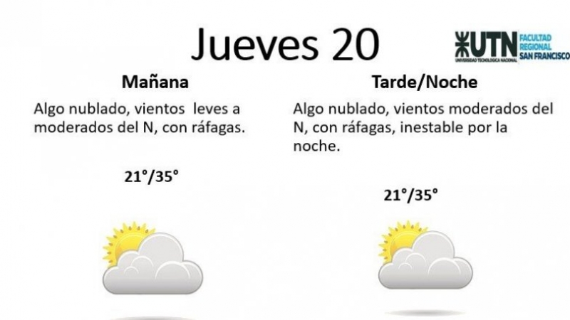 El jueves, por su parte, estará "algo nublado, con vientos leves a moderados del N, con ráfagas, inestable por la noche". La temperatura mínima es de 21° y la máxima de 35°.