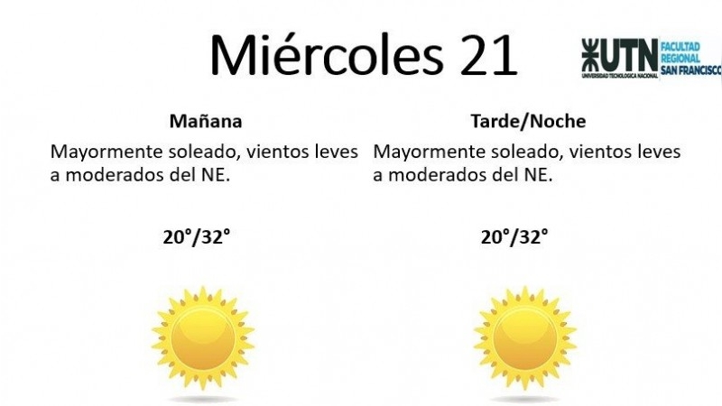 Según el pronóstico emitido por la Estación Meteorológica de la UTN San Francisco, se esperan jornadas calurosas durante los próximos días, con predominio del buen tiempo hacia el jueves.