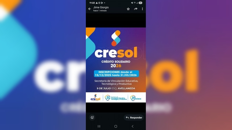 La Municipalidad de San Francisco, a través de la Secretaría de Vinculación Educativa, Tecnológica y Productiva, informa que hasta 31 de marzo del 2026, se llevará a cabo la inscripción para acceder a los créditos Solidarios CRESOL destinados a todas aquellas personas que inician una carrera de nivel superior o universitario y están interesadas en obtener este beneficio. Para ello, se deberá completar el siguiente formulario digital:https://docs.google.com/forms/d/1xEkReJbltTKZH6Du_S3y8KdHkEIR2x1AaZdlR6ve3ig/edit