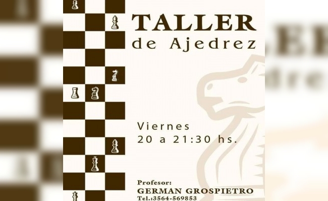 Para los interesados en el juego de mesa del ajedrez, podrán formar parte del taller los días viernes de 20 a 21:30hs, coordinado por el profesor German Grospietro. Para más información comunícate al 3564-569853.