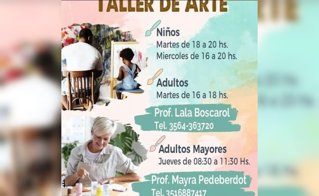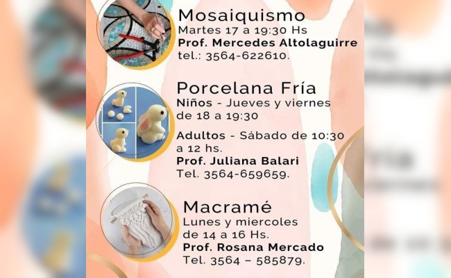 Dirigida a todas las edades, llevarán a cabo los cursos en distintos turnos. Para los niños, tendrá lugar los días martes de 18 a 20hs y los miércoles de 16 a 20hs. Para los adultos, los días martes de 16 a 18hs. Los dos primeros turnos serán dictados por la profesora Lala Boscarol, para más información, comunícate al 35664-363720.