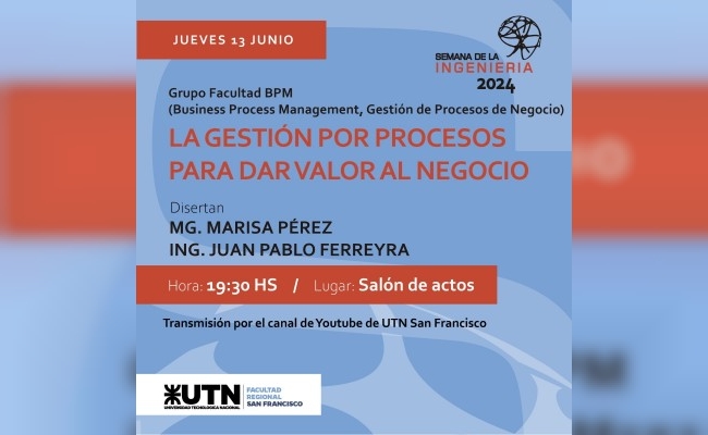 A las 19.30 la Mg. Marisa Pérez y el Ing. Juan Pablo Ferreyra, del Grupo BPM (Business Process Management, Gestión de Procesos de Negocio), hablarán de “La gestión por procesos para dar valor al negocio”.
