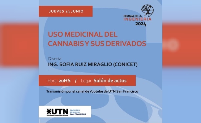 A las 20, la Ingeniera Sofía Ruiz Miraglio (CONICET), se referirá al “Uso medicinal del Cannabis y sus derivados”.