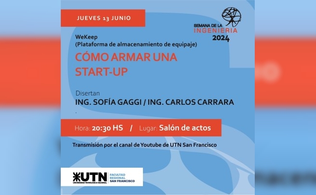 Y a las 20.30, los Ingenieros Carlos Carrara y Sofía Gaggi se referirán a “Cómo crear una start-up”, comentando el caso de WeKeep, la plataforma que crearon y lideran Carrara y Galli, graduados de UTN San Francisco. Esta app apunta al almacenamiento de equipaje, y tuvo un notable crecimiento desde su creación.